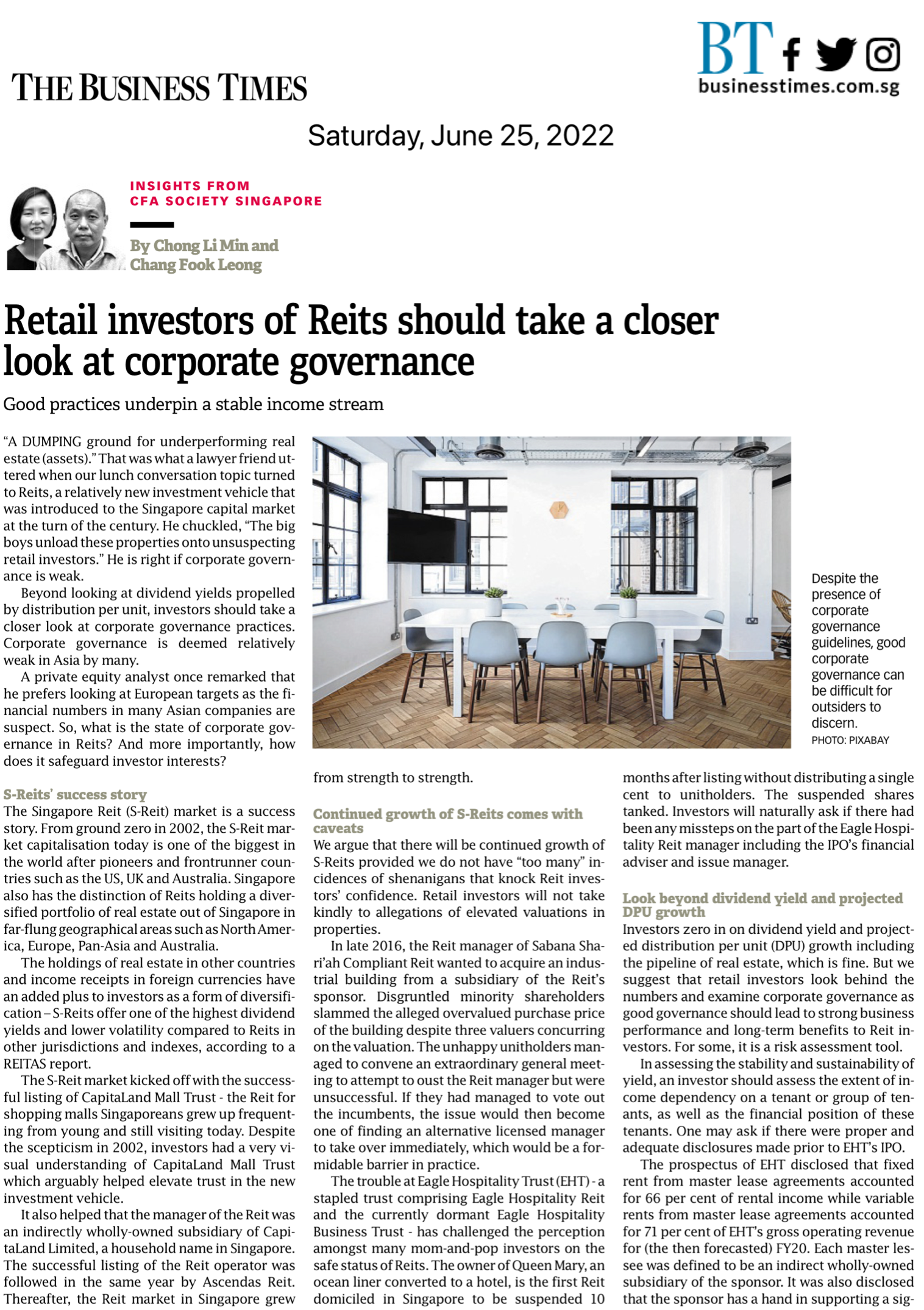 Nevertheless, we still suggest that retail investors take a close look at corporate governance practices of Reits before investing as good practices underpin the stable income stream that we have come to expect from Reits.