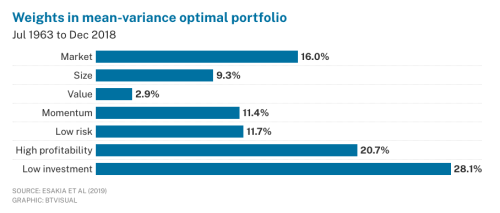 The graph shows the factor weights that maximise the Sharpe ratio of an investor who can choose from a menu featuring the market, size, value, momentum, low-risk, high-profitability, and low-investment factors, which have been widely used in both academic and practitioner research.